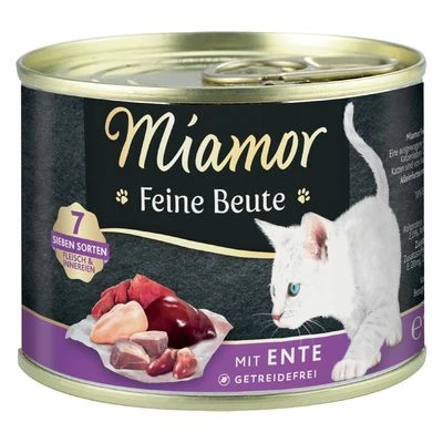 Miamor Feine Beute är helfoder för vuxna katter som säkerställer att katten får en avvägd, artanpassade kost. Det består av balanserade sammanställningar av kött och ätliga organ och innehåller inte spannmål – det passar alltså utmärkt för näringskänsliga djur som lider av allergier eller näringsintolerans. Och sist men inte minst: med det utsökta urvalet av fyra olika sorter får katten garanterat variation på menyn.